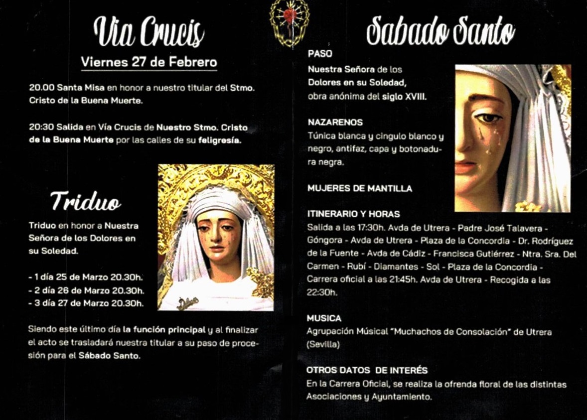 Consulta aquí todos los detalles sobre los actos, horarios y recorridos de la Asociacion Parroquial la Borriquita y Nuestro Padre Jeús de Amor y la Pasión, y la Hermandad del Santísimo Cristo de la Buena Muerte y Nuestra Señora de los Dolores en su Soledad durante esta Semana Santa. Vive cada momento con devoción y participa en una de las manifestaciones más solemnes de nuestra tradición.