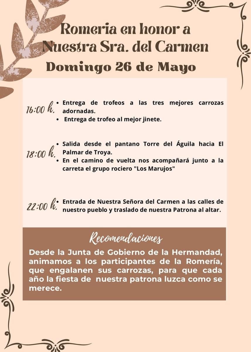 En esta zona, por seguridad, no estará permitido el acceso de vehículos. El camino de la comitiva de la Virgen Nuestra Señora del Carmen, tanto en la ida hacia el Pantano Torre del Águila el sábado 25 como la vuelta hacia nuestra localidad el domingo 26, se realizará por las carretas SE-9015 y SE-9016, por lo que el tráfico de vehículos durante el cortejo se verá afectado. Rogamos se planifique la visita en consideración a estas medidas.