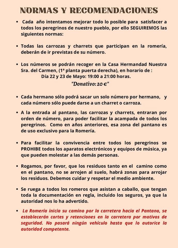 - En el transcurso de la romeria de camino de ida y vuelta la carretera se vera afectada para los vehiculos exentos de la comitiva de la romeria.