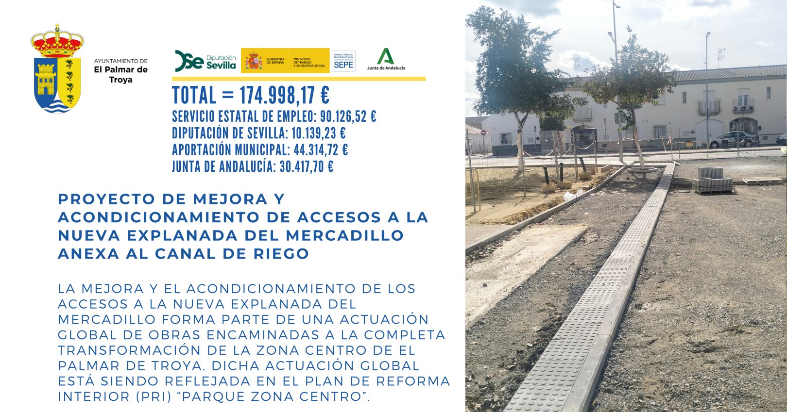 Con una inversión total de 2.993.778,82 €, seguimos trabajando para mejorar la calidad de los servicios públicos y el día a día de nuestros vecinos y vecinas. Estas actuaciones permiten modernizar infraestructuras, mejorar espacios públicos y reforzar los servicios municipales, contribuyendo de manera directa al desarrollo social, económico y turístico de El Palmar de Troya.