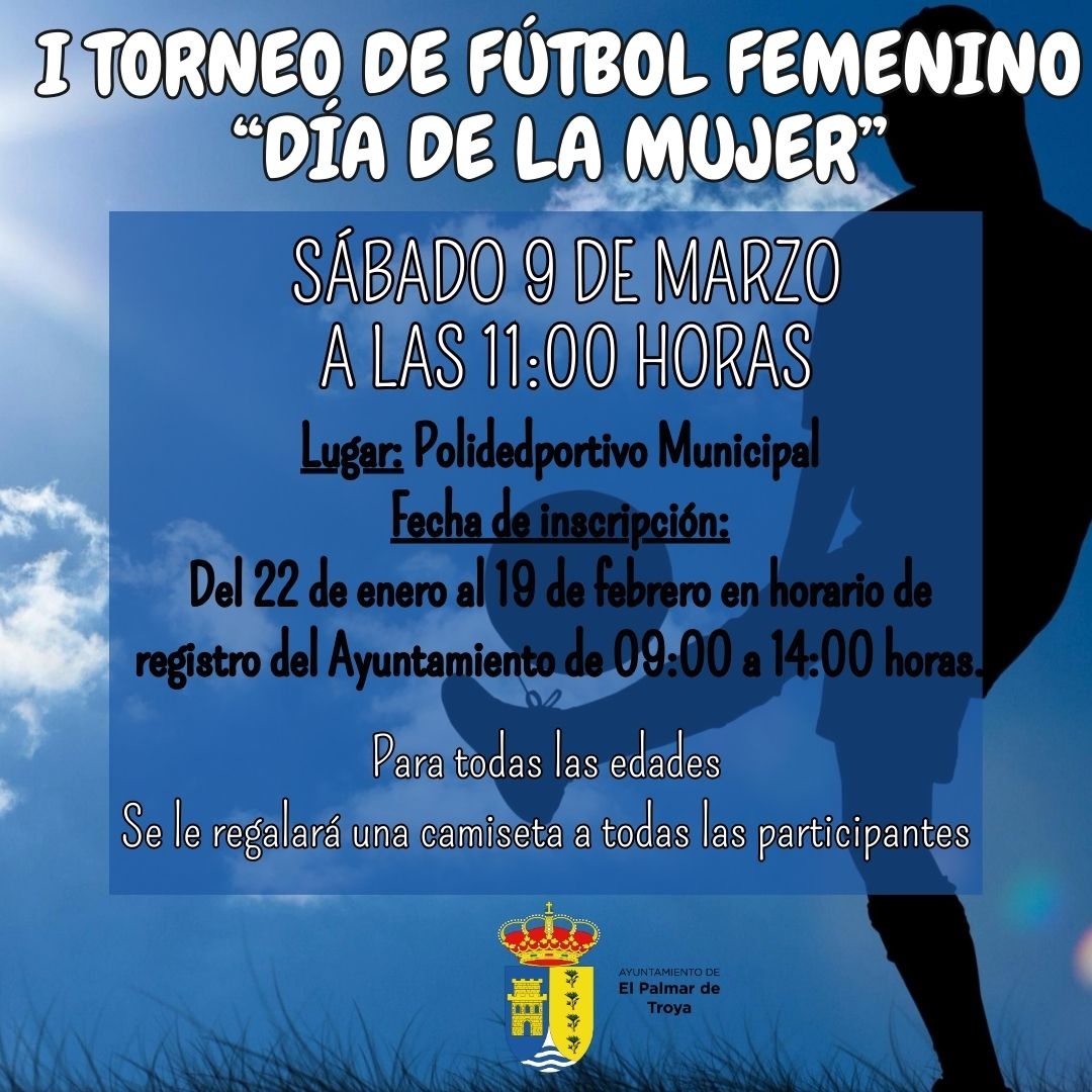 Con motivo de celebración del Día de la Mujer, el próximo sábado 9 de marzo tendrá lugar el I Torneo de Fútbol Femenino del “Día de la Mujer” del Ayuntamiento de El Palmar de Troya. El evento, organizado conjuntamente por las áreas de Igualdad y de Deporte del Ayuntamiento de El Palmar de Troya, se realizará en las instalaciones del Polideportivo Municipal a las 11:00 horas.